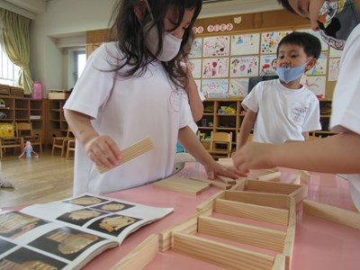 最初は遊び方に戸惑いが隠せず、「せんせい、できな~い」と先生にSOSを求めるクラスも。絵本に載っている見本はとっても立派な作品ですが、ハードルが高めなので、いきなりは難しいかもしれないね。