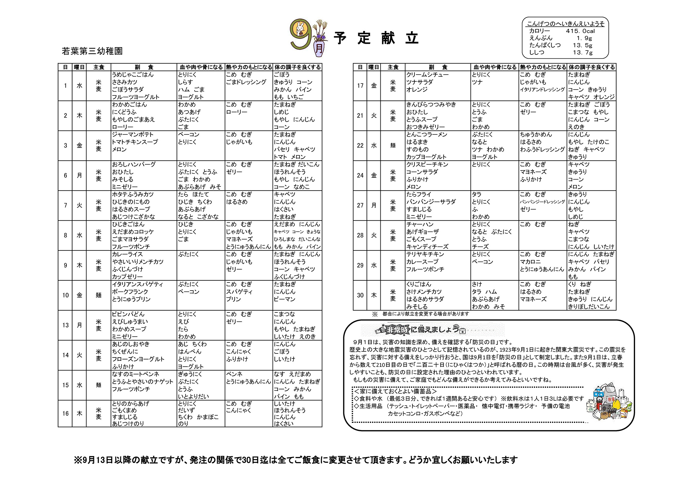 9月の献立が変更となりました。ご確認ください。