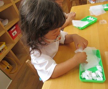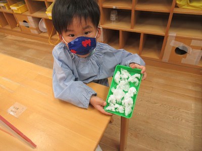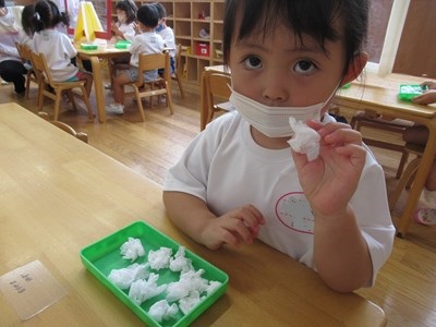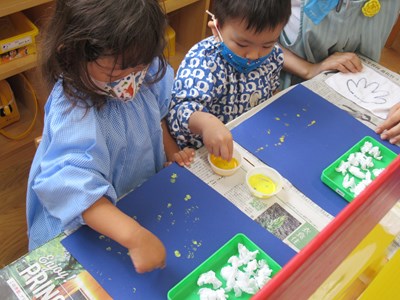 「ふわふわ」「コロコロ」「ちょんちょん」「キュッキュッ」「ペタペタ」「ポンポンポン」・・・小さな指先で、心地よい感触をいっぱいに感じながら、楽しんで取り組んでいた姿をご覧ください😊