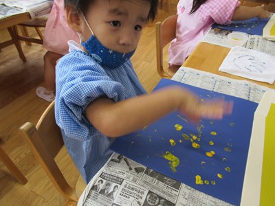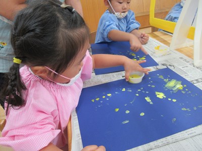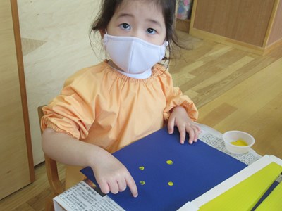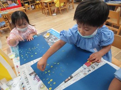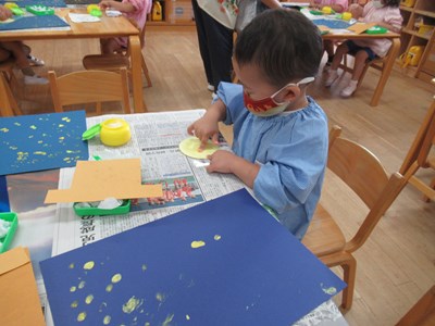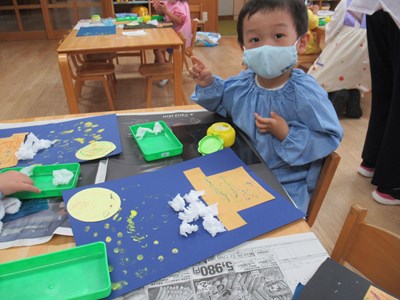 黄色いや白色の絵の具が、みんなのお指で、お星様に変身していきました。