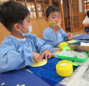 「こうやって、粘土のおだんごみたいにくるくるするとね・・・ほら、できたよ!」先生の白くてま~るいおだんごを見て「わたしも!」「やってみたい!」