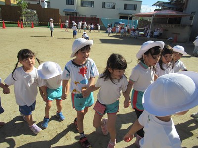 鬼ごっこのあとは、年少組~年長組まで、みんなで花いちもんめをして遊んだよ。