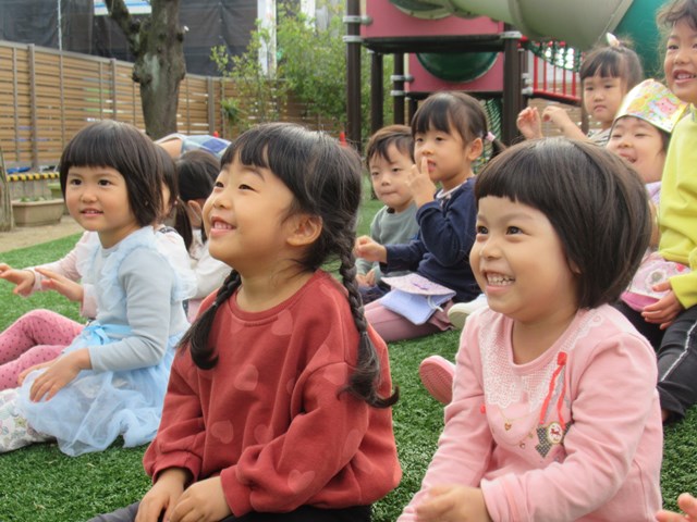 これまでお部屋でマスクをつけたまま、クリス先生と英語の発音をしてきた子ども達でしたが、「広い園庭ならマスクをとってのびのびと発音できる!」ということで、今回、年少組さんは園庭の芝生全体に広がって『ハロークリス!in Garden』を行いました。