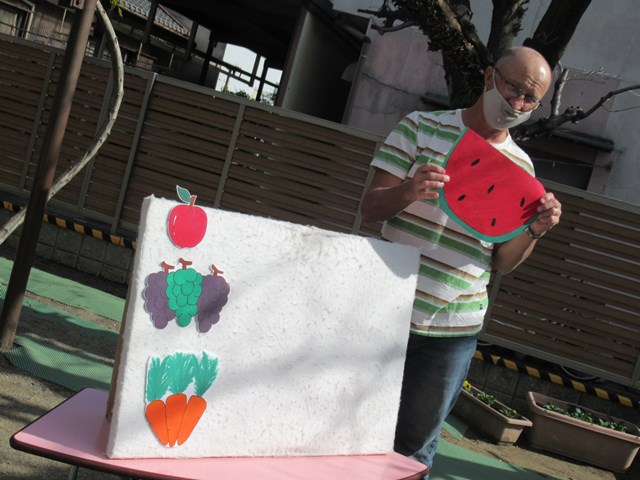 子ども達は、お話に出てきた果物を見ながら「apple!」「carrots」「watermelon」などとクリス先生と発音しました。