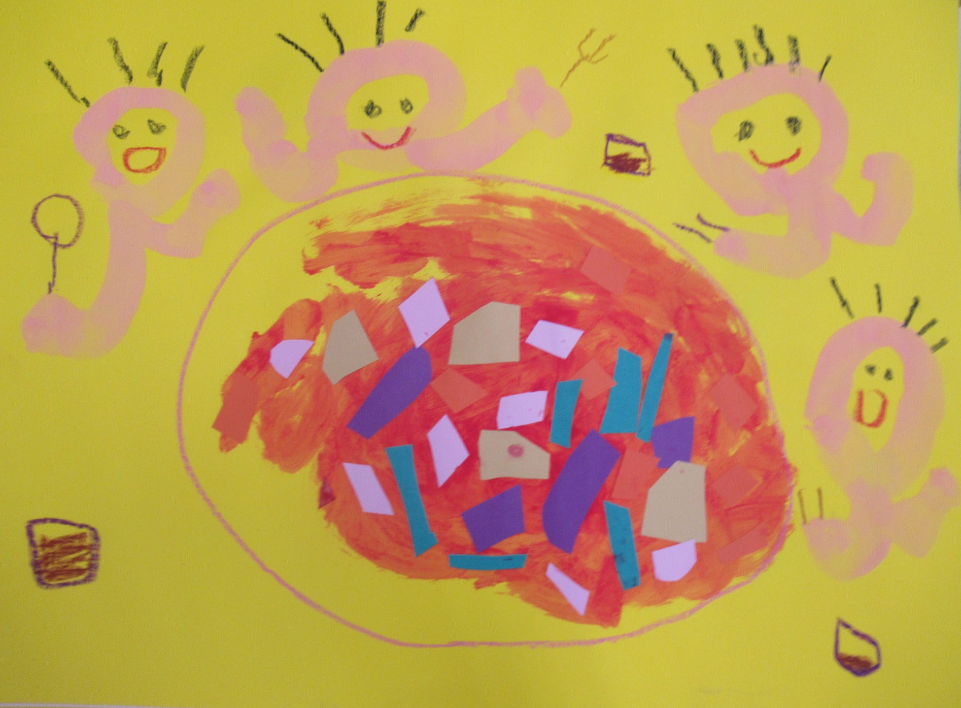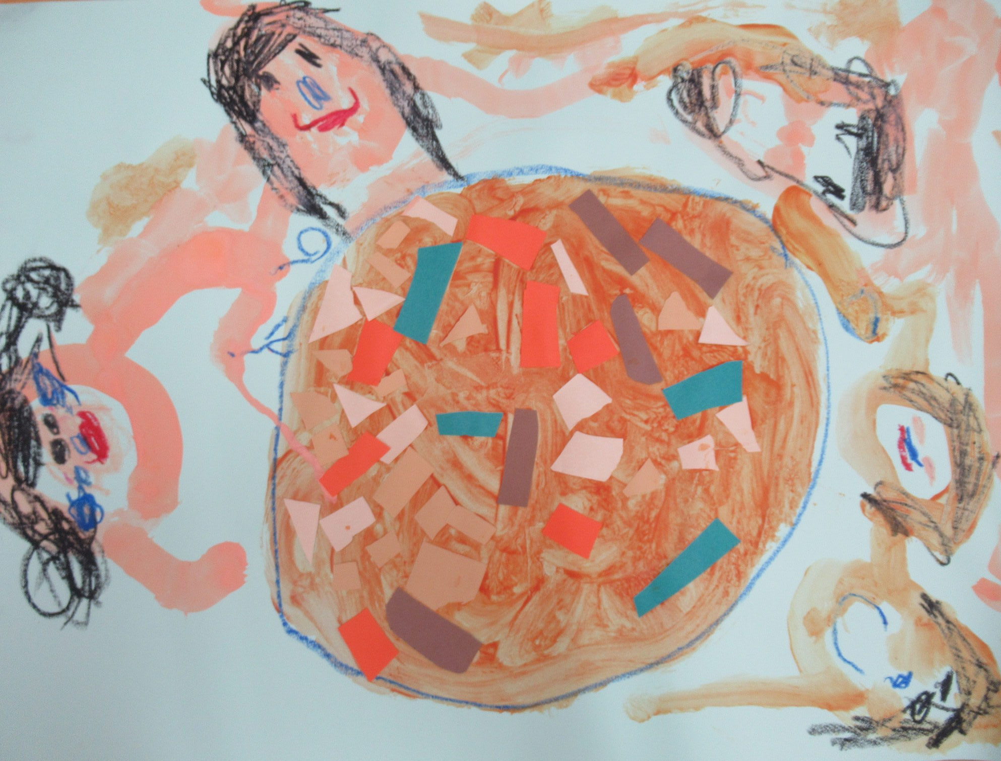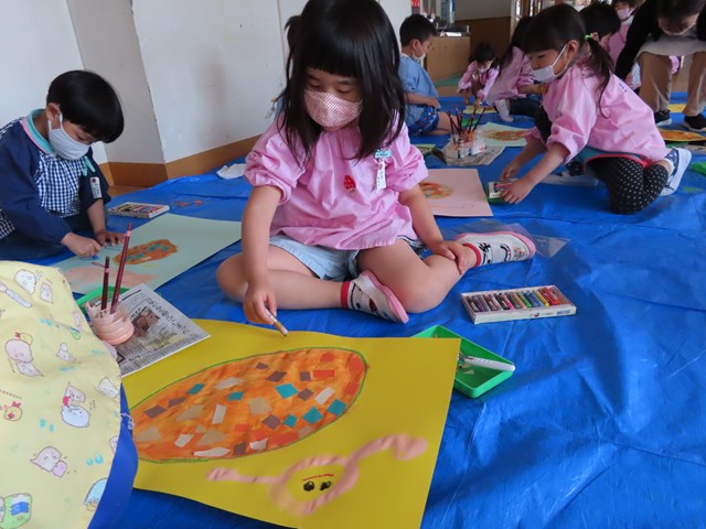 子ども達は、自分や家族、お友だちなどが食べている様子を、パールオレンジの絵の具で描いていきました。