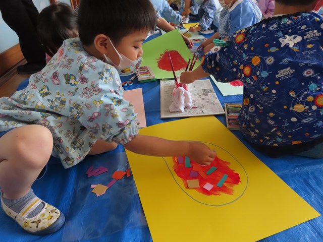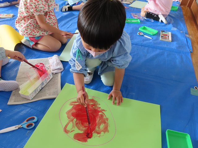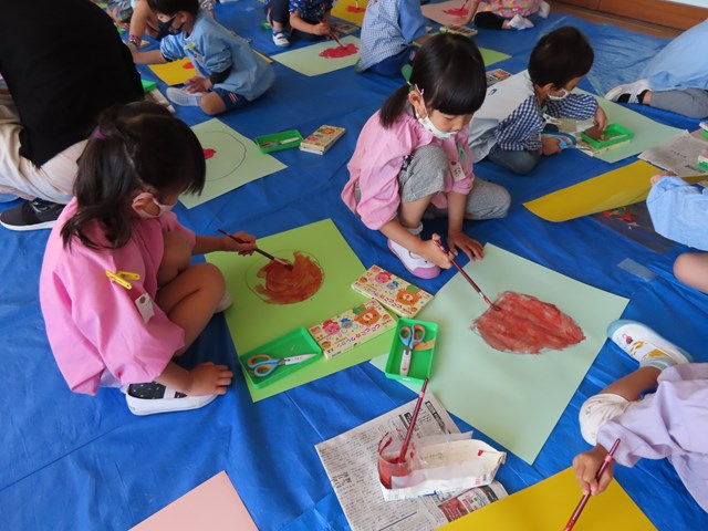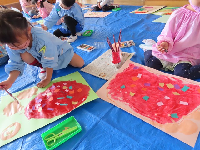 お鍋やお皿をぐるぐるっとクレヨンで描いて、絵の具で自分の決めたソースを塗り拡げていきました。ぺたぺたと絵筆を動かす度に、熱々のシチューやトマトソースが増えていくので、子ども達はますます夢中で塗り拡げを楽しみましたよ。