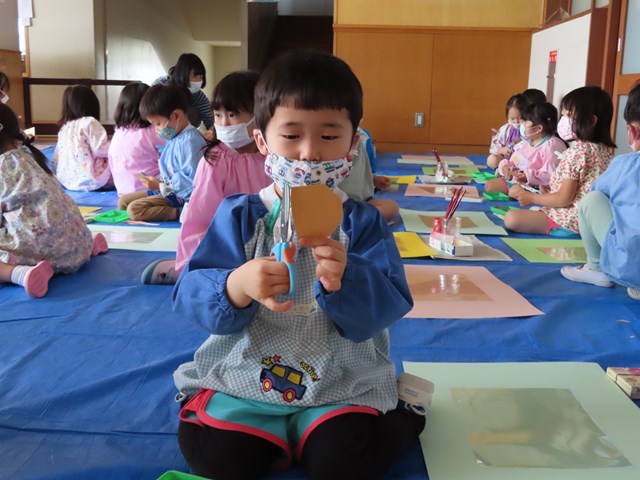 四角い画用紙の角をチョンチョンと切り落とします。「できた!」
