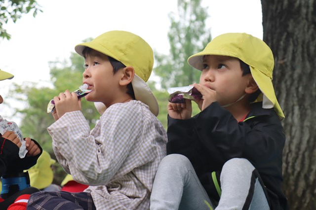 広場で思いっきり遊ぶ前に、パワーチャージ!「おいしいね~」と味わう姿が微笑ましい『おやつタイム』です😊