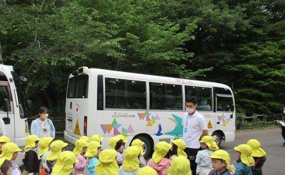 5月17日の年長組・どこでもドアの日。いよいよ後半チームのさくら組とつばき組の子ども達が乗ったバスが到着。