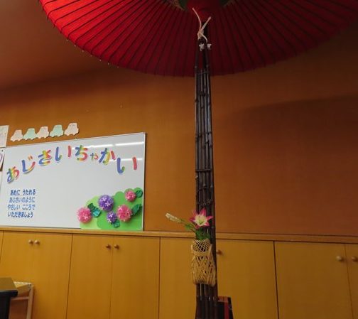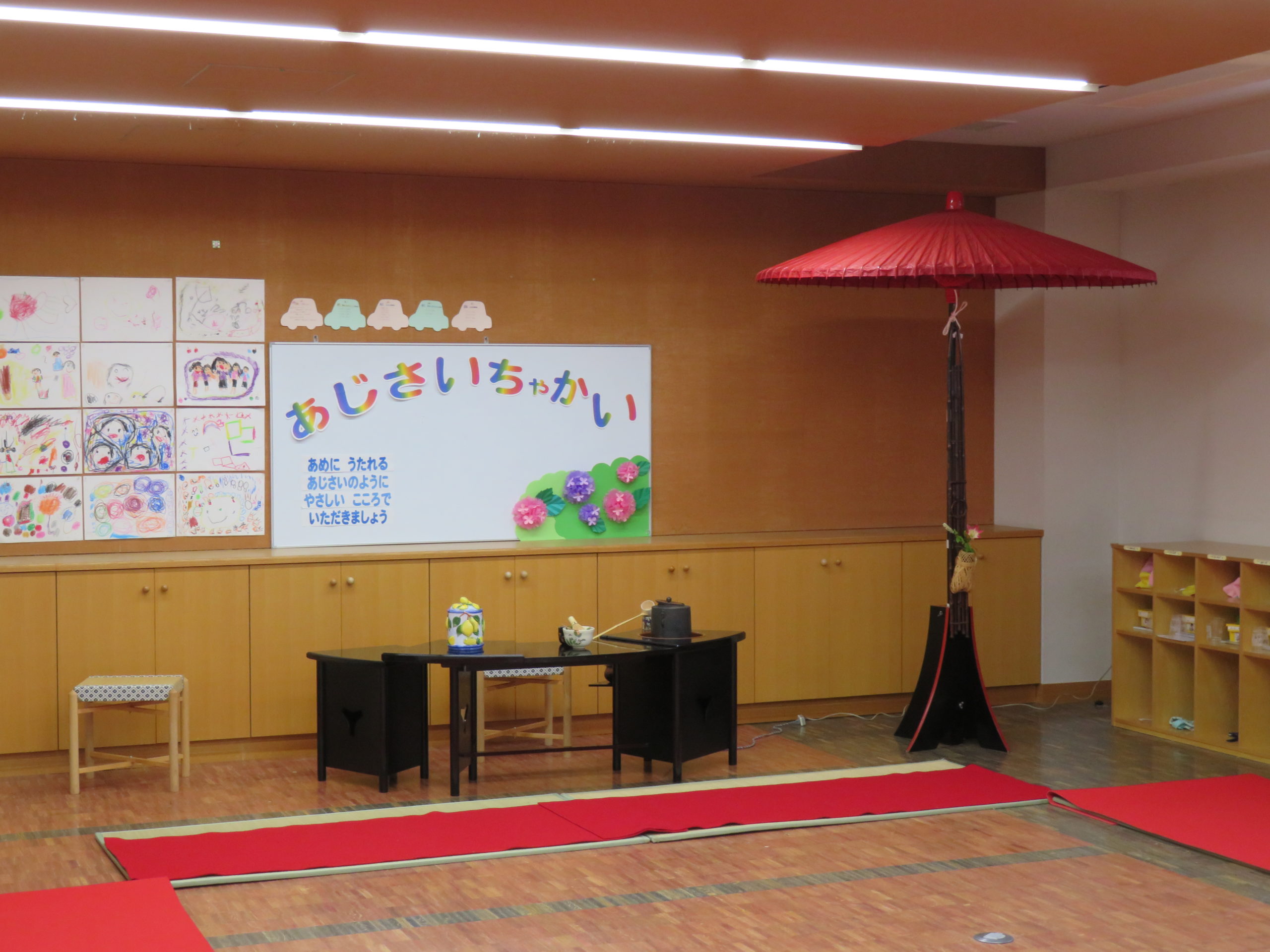 いよいよ5月26日(木)、日比野宗悠先生を招いての『あじさい茶会』を開催しました。本来は園庭で『野点(のだて)』を行う予定でしたが、お天気があいにくの雨となってしまい、急遽、室内を野点仕様に準備。