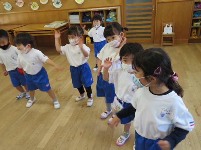 「しあわせなら足ならそ!」の「ドンドン!」が面白くって身体をいっぱいに使って、跳び上がってる子もいたよ。