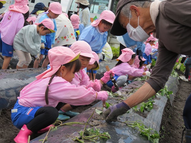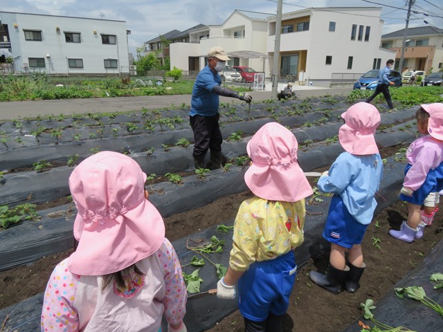 でも、だいじょうぶ!ボランティアの方が、植え方を丁寧に教えてくださいました。みんなはどきどきしながら真剣に見つめていたね。