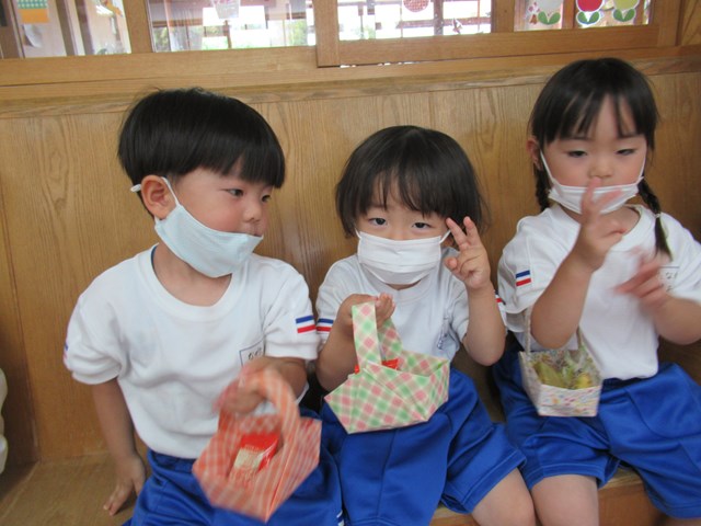 お菓子でいっぱいのかごをのぞき込んで、とっても嬉しそうな子ども達の姿。見ている私たちまで嬉しくなっちゃいます😊