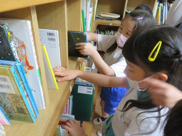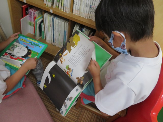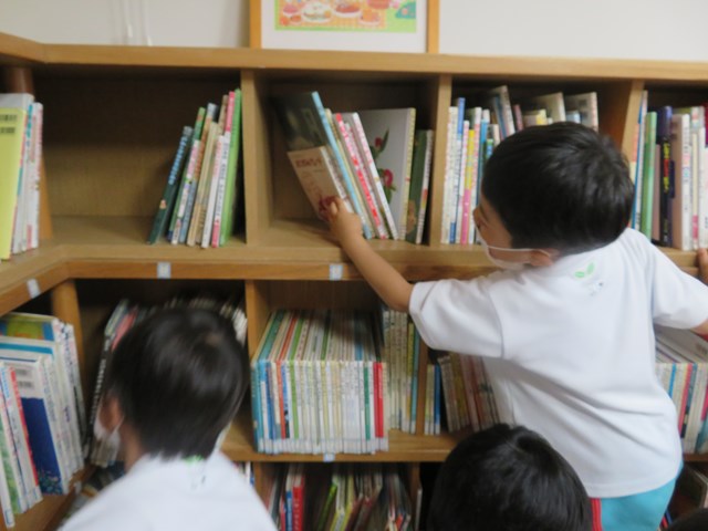 早速、年長組さんが絵本を借りにやって来たよ!「どれにしようかな・・・」
