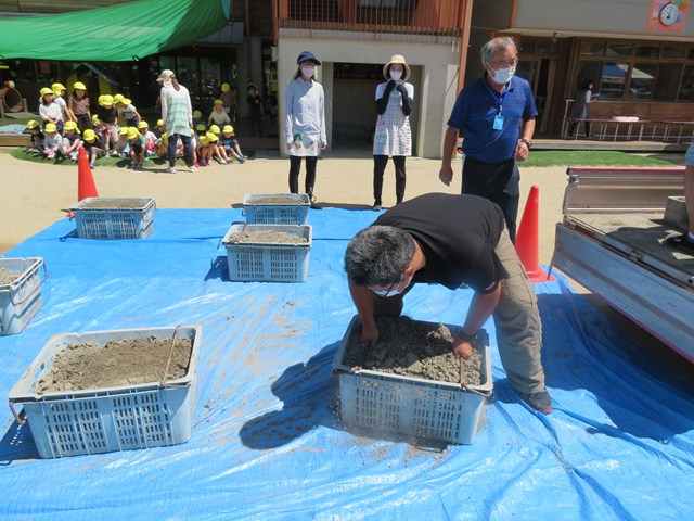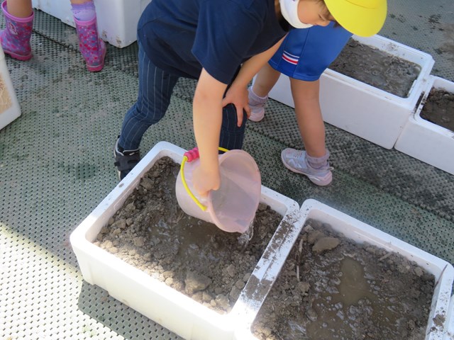 芋の苗植えと違う点は、自分達で田植えの土から準備することです。事前に園長先生が、昨年お店屋さんごっこでお世話になった『魚和』さんにお願いして下さった発泡スチロールの大きな箱が30個近く、『ベジタブルるんるんファーム』にずらりと並びました。