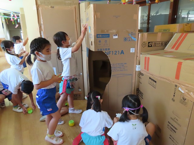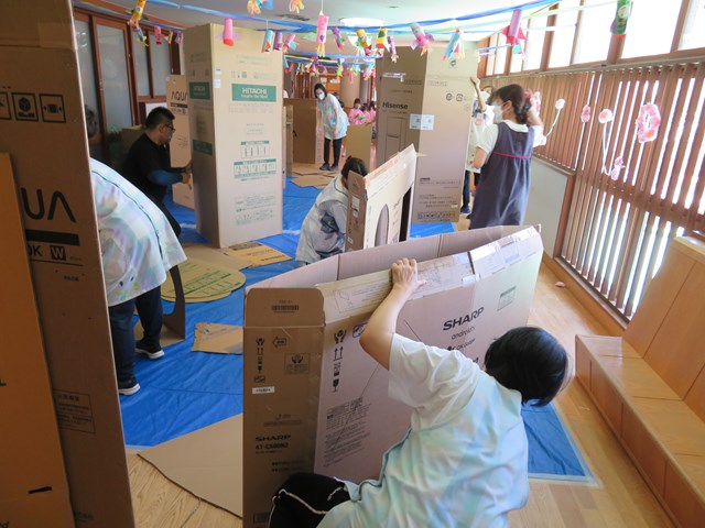 いくつか空いている大きな穴を見ていると「あ~早くはいりたい!!」と思えてくるみたい😊子ども達に秘密で私たちも一度みんなで入ってみたところ、「出口がなかなか分からない💦」とびっきりワクワクする迷路がやっと完成!!