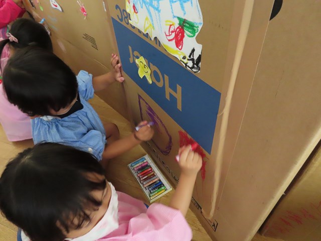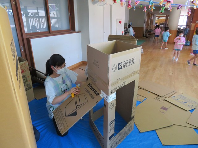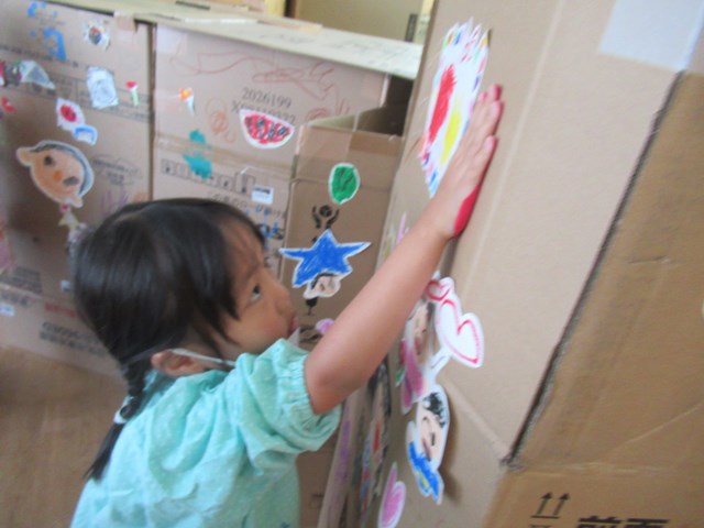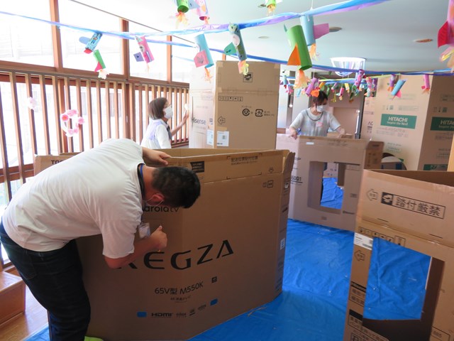 今回は先生達も頑張りました✊大きな大きな段ボールを運転手さんが何度も集めてきてくれたからこそ、作り上げることが出来た『巨大迷路』。