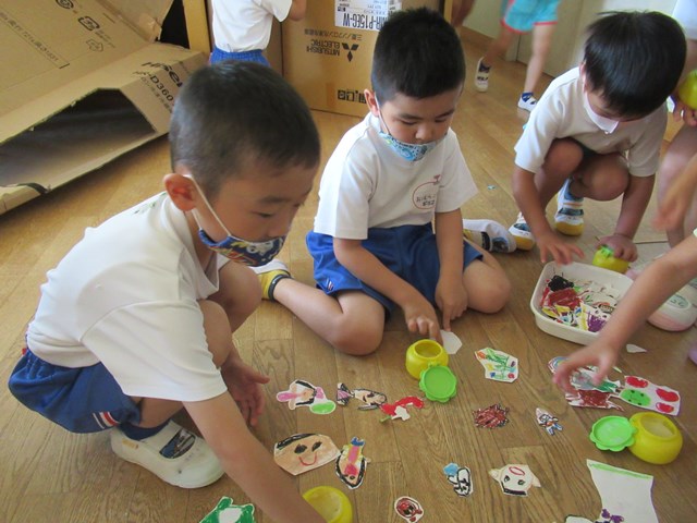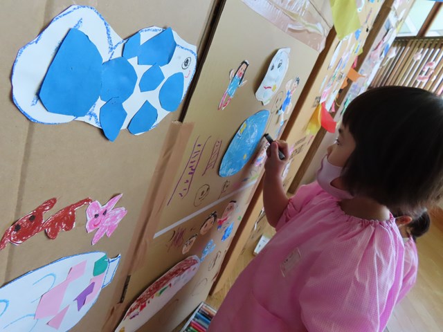 年長組さんは、思い思いの絵を描いた後に、ハサミを駆使してとても上手に形を切り取っていましたよ。