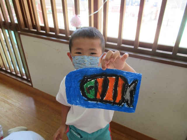年中組さんは、大きなロケットや、お魚などを作りました。七夕だから、天の川を泳いでいるお魚かな・・・?とっても嬉しそうに見せてくれたね。