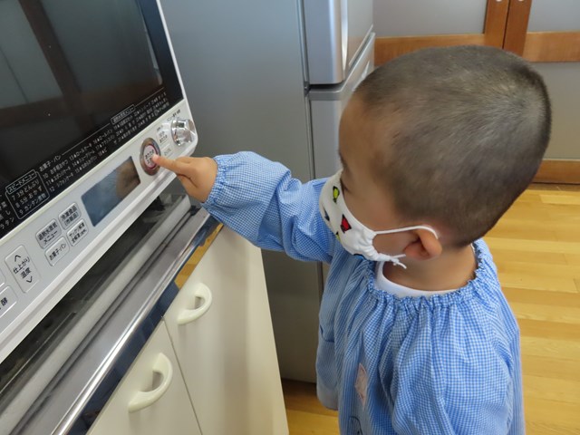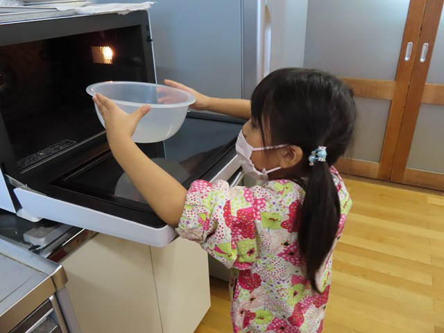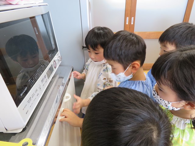 先生に見守られながら、電子レンジをぴぴっ!さあ、どうなるのか、みんなはワクワクしながら待っていたね。