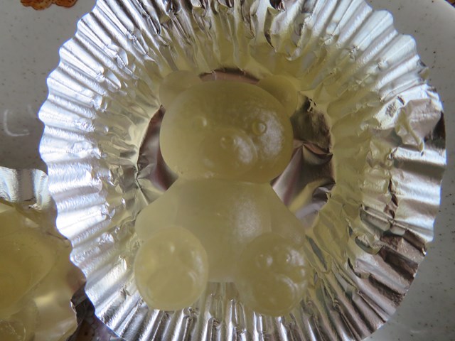 先生がくまさんの型からグミをゆっくり押し出して、お皿にのっけてくれたよ。