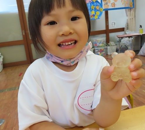 実は今回、先生達がこだわったのは、このくまさんの形。型から中身を押し出すときに、くまさんのお顔が崩れたら子ども達ががっくりするから、出来るだけつるんとした、きれいなくまさんのグミが出来るようにと、毎日放課後にこっそりと試行錯誤していた5人。型の内側を水で濡らしてみたり、少しサラダ油を塗ってみたり。またゼラチンとジュースの配合も変えてみて、より進化していったグミたちです。