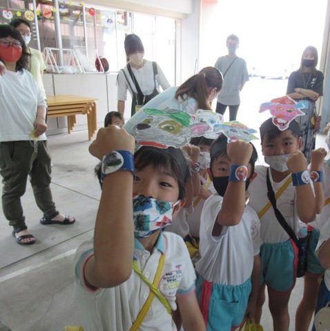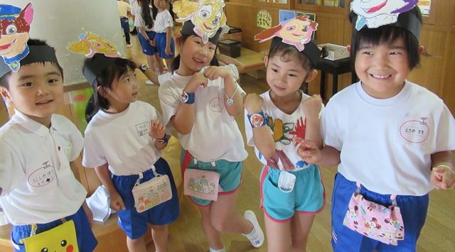 子ども達は大好きなキャラクターのお面とリストバンドを装着しての登園です!