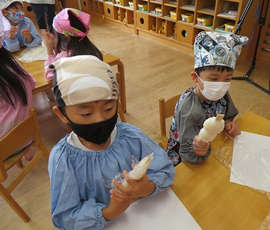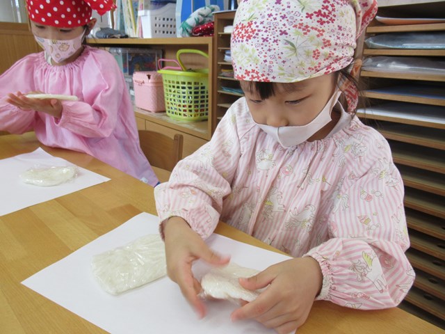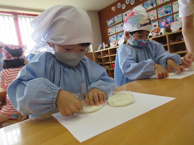「みんなの指や手の力を使ってお米をぎゅっと潰してお餅にするんだよ。」先生のお手本を一生懸命に見ながら、子ども達ははりきってスタート!!