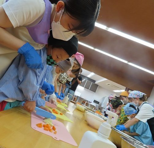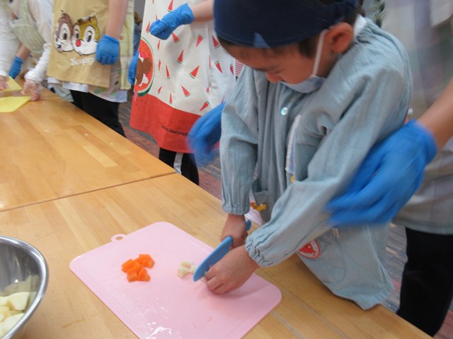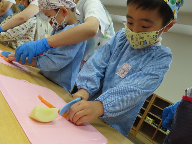 今年は、利き手の反対の手を猫の手にして、自分たちで包丁を使って一生懸命に切りました。