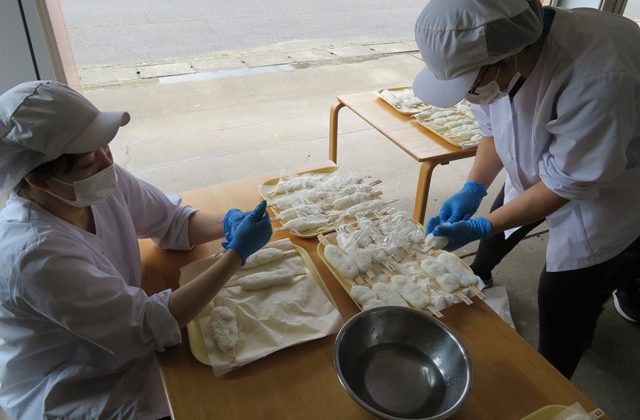 美味しいお味噌のたれを塗ってくれる先生や運転手さんたち。炭火焼で熱いから気を付けてね。