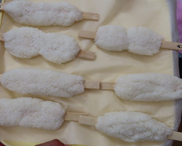 出来上がったらサランラップを外して、五平餅の棒にお餅を巻き付けて押さえるんだよ。