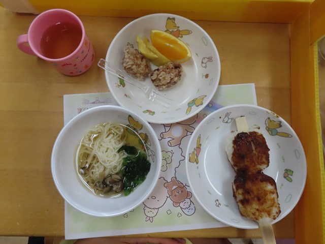 オリジナル五平餅・冷製そうめん汁・唐揚げ・手作りポテト(きたあかり使用)・オレンジ
