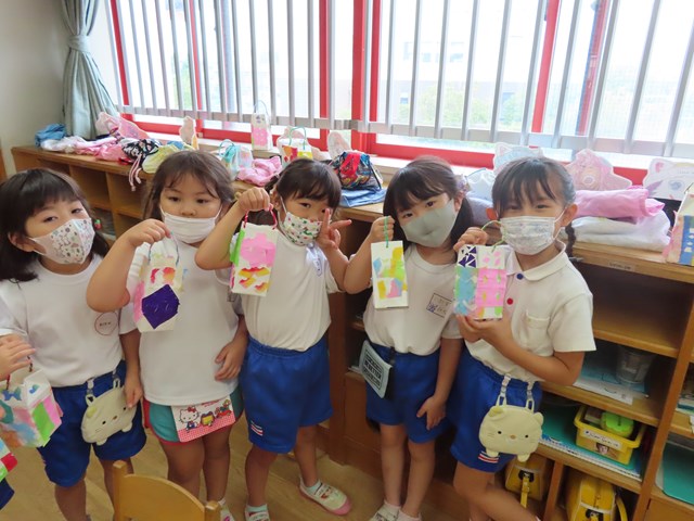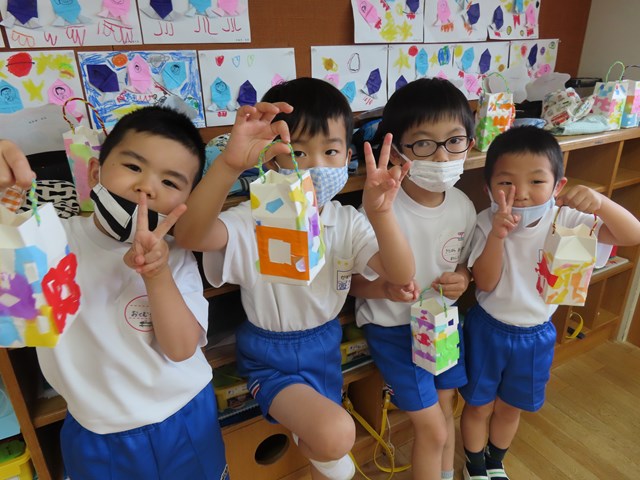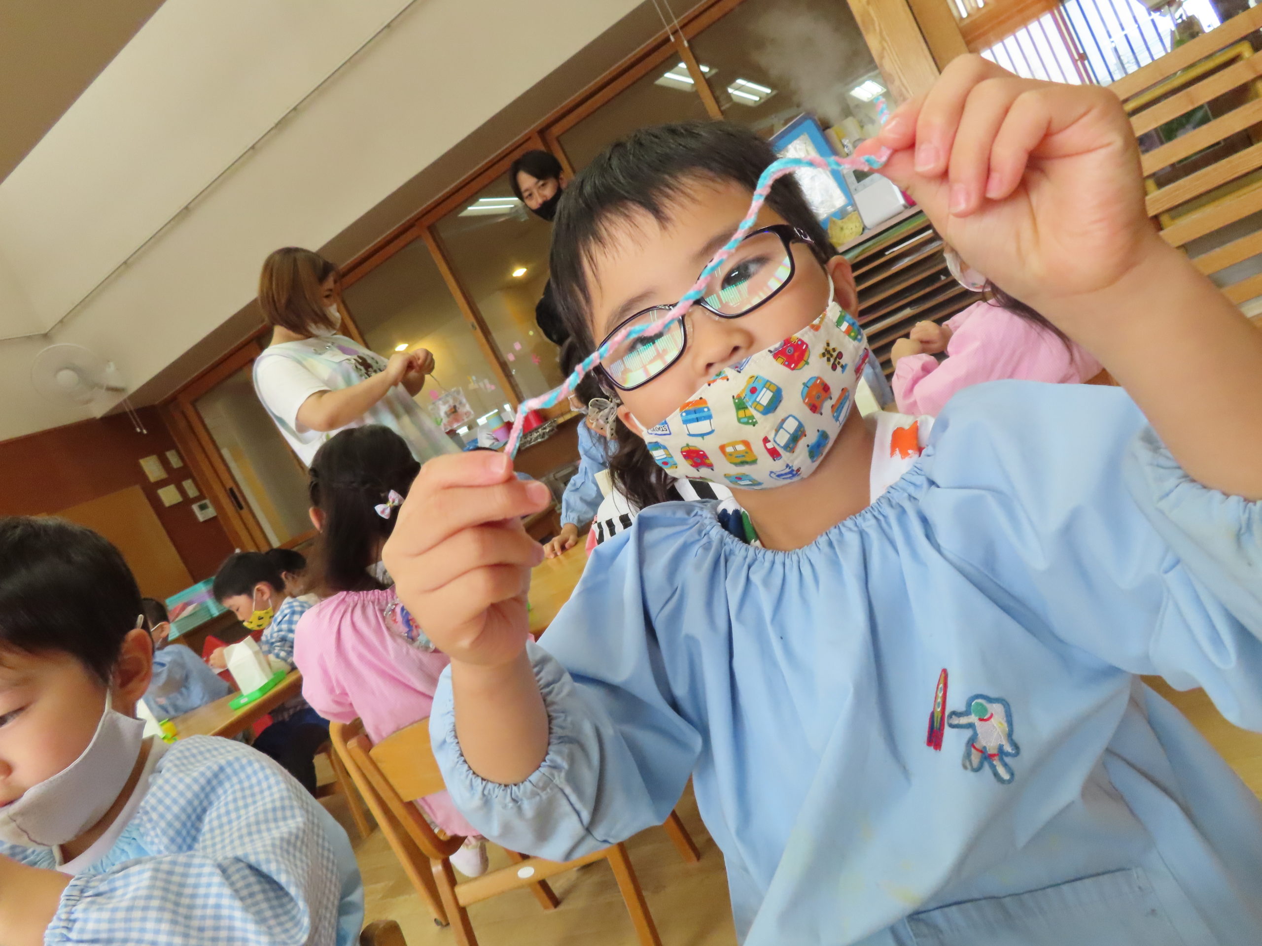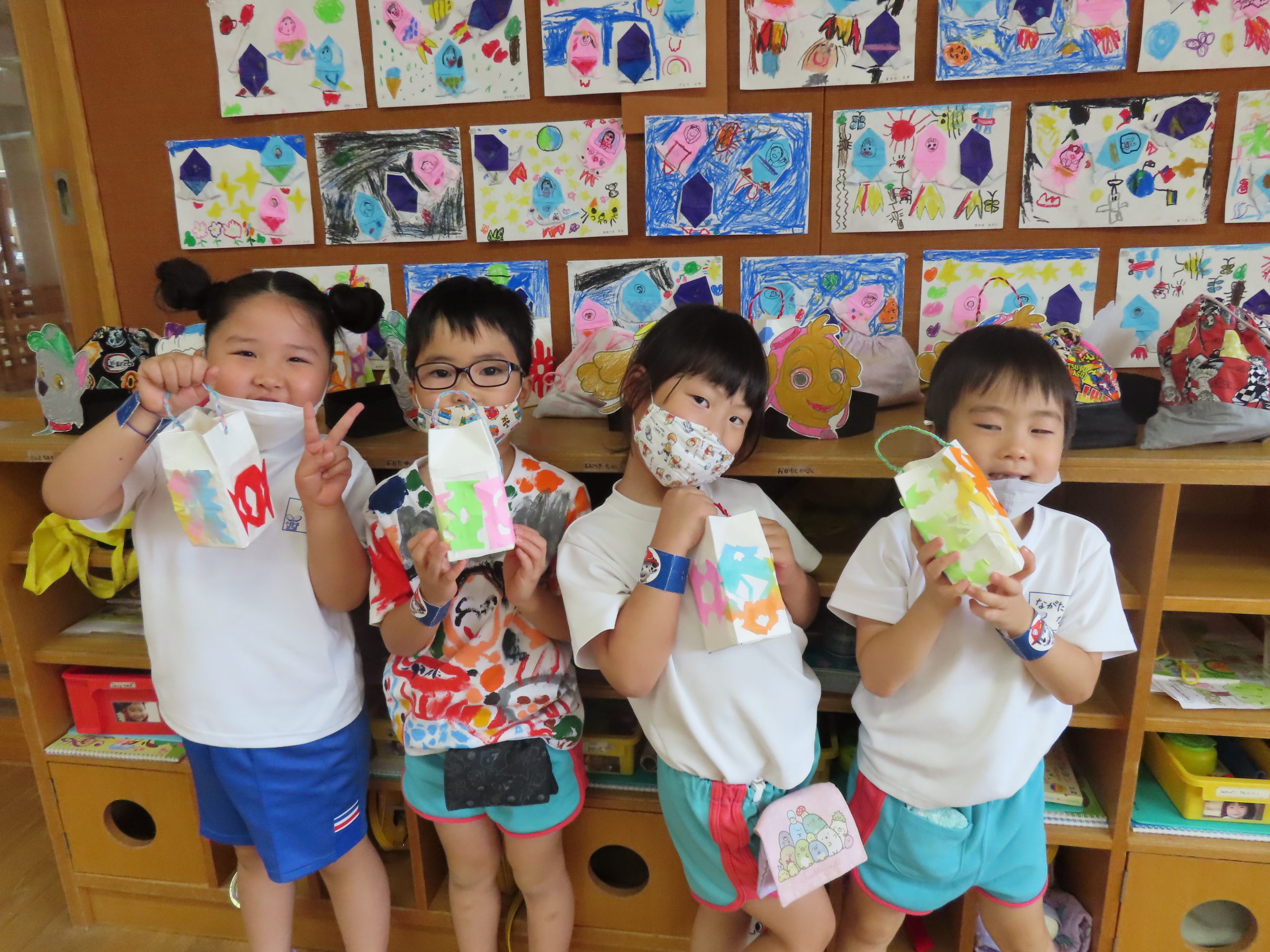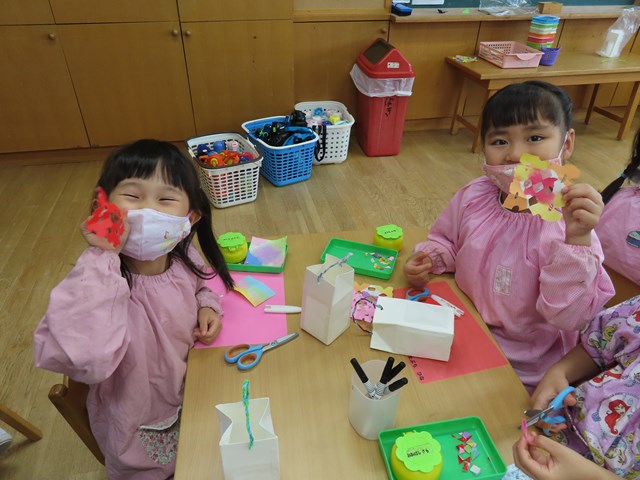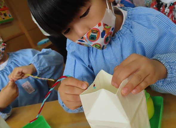 はさみを上手に使えるようになってきた年長組の子ども達。今回は、自分で染めた和紙や色紙を飾り切りしてのりでランタンの周りに貼りましたよ。