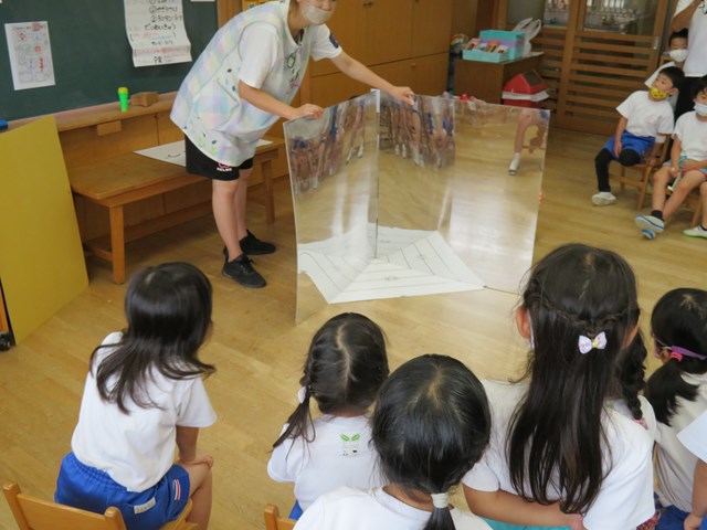 他にも、ひとつの花びらがきれいなお花になったり、雪の結晶が出来たり、3本の線に沿って鏡をおいてみると、なんとクモの巣まで出来ることを、発見した子どもたち。もう鏡の世界に夢中です。
