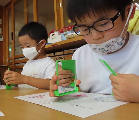 今度は、面白いプリントが配られたよ。鏡で映してみようね。