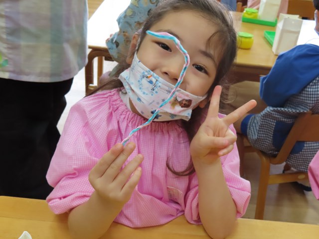 また、2色のモールを交互に編んで、バッグの持ち手のように取り付けていこうね!