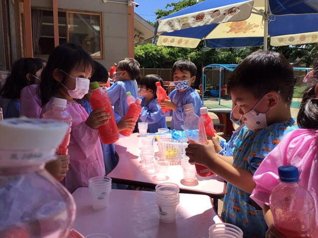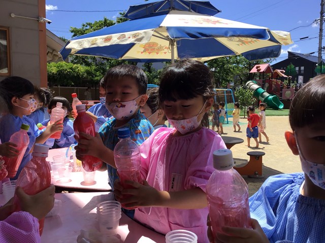 そして、この季節ならではの色水遊びもしたね。色の種をペットボトルに入れてフリフリ・・・気が付くと「あっ!赤くなったよ。」「赤から紫色になったよ!」みんな、大発見にびっくり😲