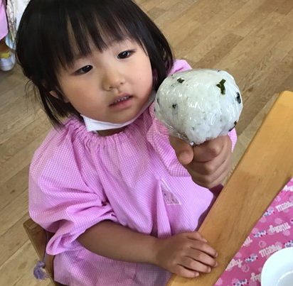 ちいさなお手々で、ぎゅっぎゅっと握ったまん丸おにぎり。お味はどうかな?