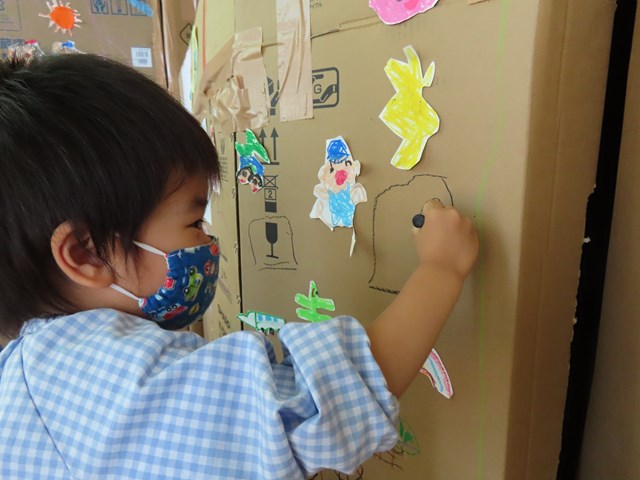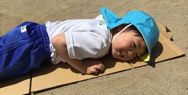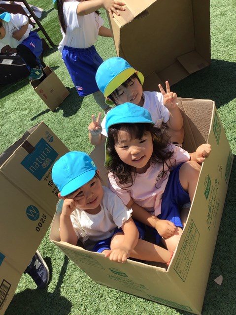 気持ちいい初夏、いろんなサイズの段ボールが乗り物や電車、お家に大変身。みんなで園庭いっぱい使って思いっきり遊んだね!!