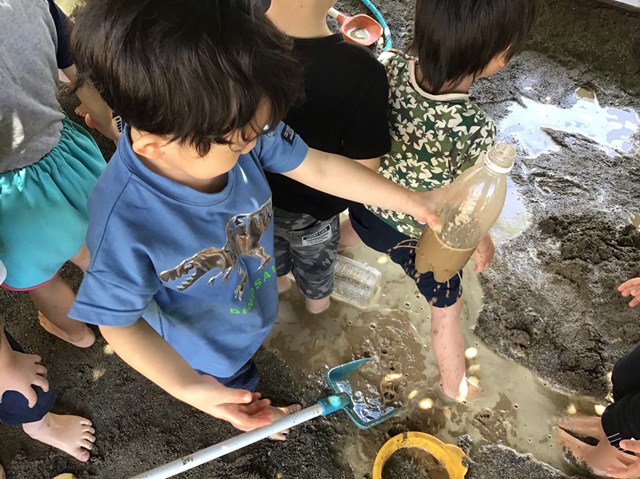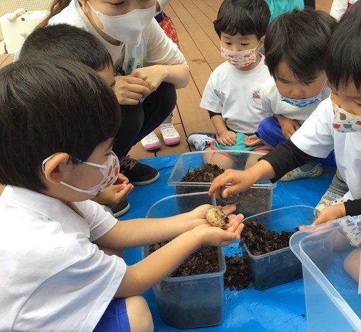 生き物コーナーでも、虫博士の園長先生に『カブト虫の幼虫の土の入れ替え』やカメの餌やりなど、お世話の仕方を教えてもらったね。コロンとした幼虫を、まるでお母さんみたいに優しく抱っこしてくれたみんな。