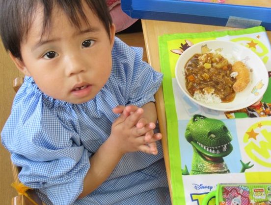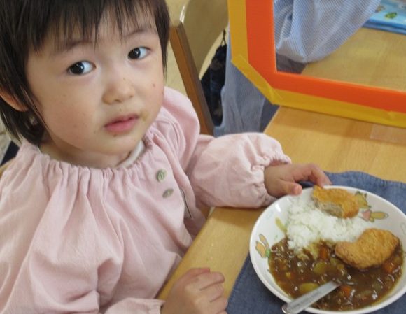 はじめての給食には、「特製わかばカレー🍛」ハート♡のにんじんを見つけて大喜び!