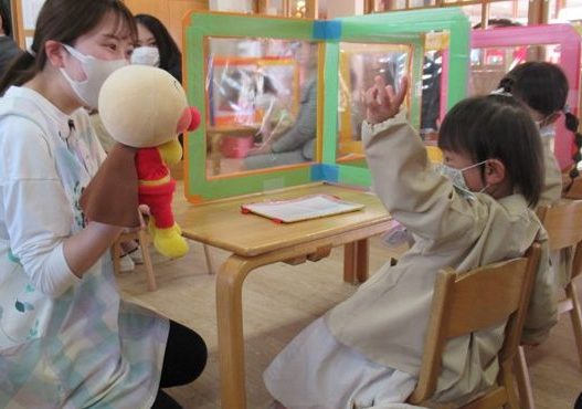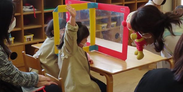 翌週から幼稚園がスタート!お家の人と離れて、頑張って登園できたみんなのところに、約束通り、アンパンマンが会いに来てくれたね。