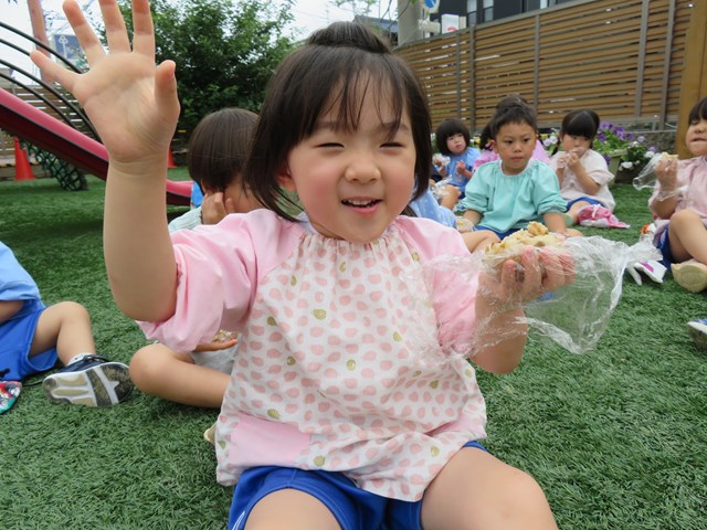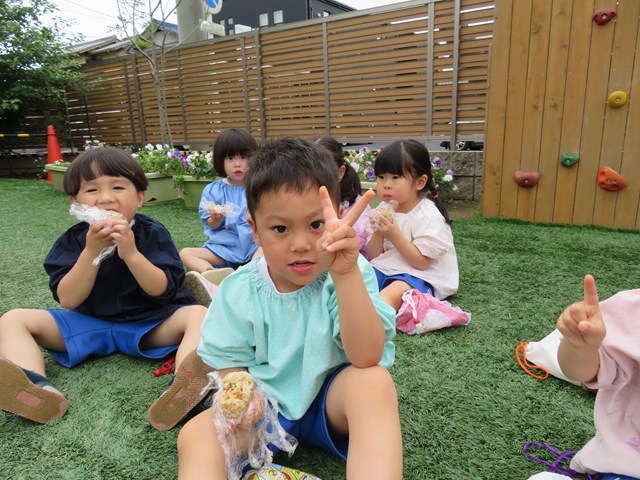 さて、気候のよい日には、こんな楽しいランチタイムにも挑戦したね。みんなでおにぎり🍙を作って、園庭にて『芝生de ランチ』にレッツゴー!!
