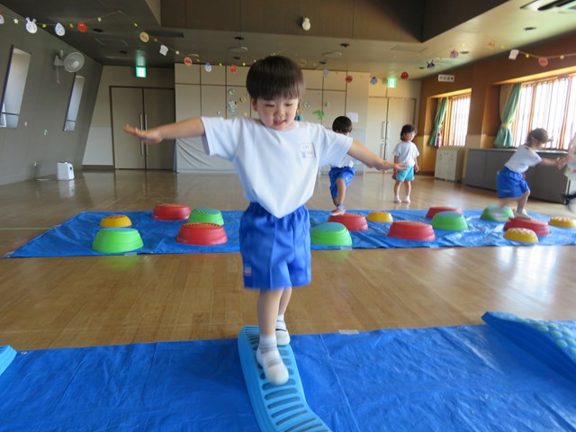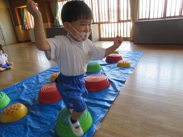 『トレジャーハンター』では、とんだり、くぐったり、バランスよく渡ったり・・・お宝をGETできた時にはクラスのみんなで大喜び。楽しみながら、体をたっぷりと動かすひとときを、今後も大切にしていきたいと思います。
