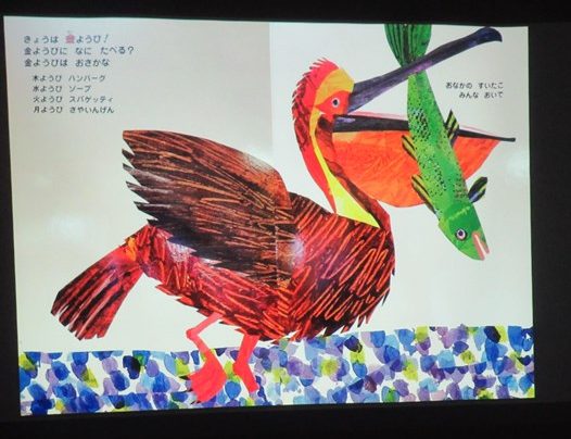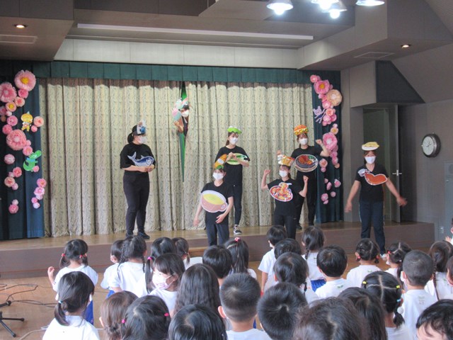 そのあと、月曜日から順に、お話に出てくる食べ物に変身した先生たちが、歌に合わせて踊りながら登場!