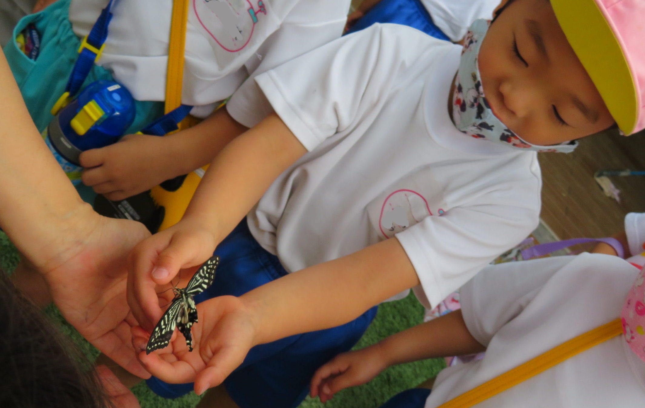 木々のいたるところに幼虫が現れるようになった、6月のある日。「お家で育てていた幼虫がアゲハ蝶になったから、幼稚園のみんなと一緒に逃がしたい!」と、ちょうちょを連れてきてくれたお友達。