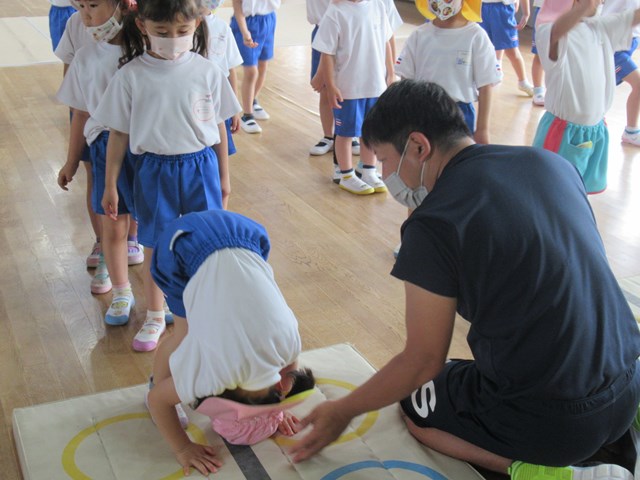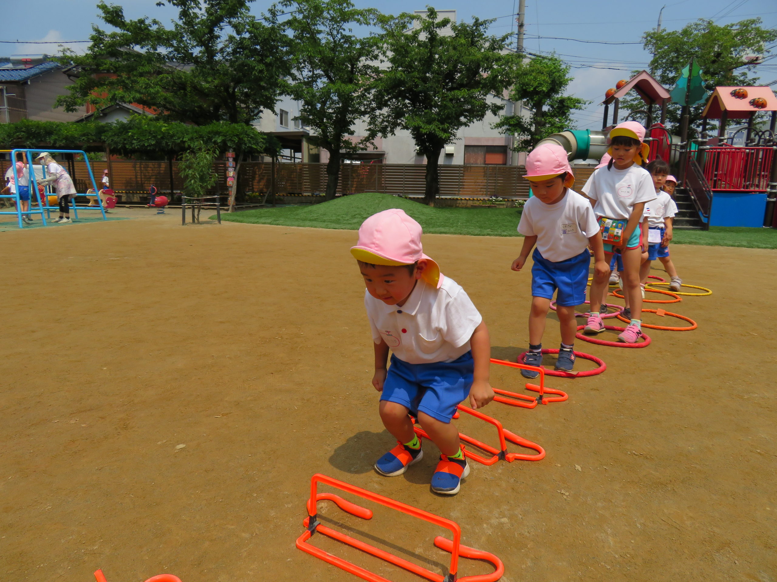 年中組では、運動大好き!を目指して『わくわくサーキット』も始まったね。得意な子も、あまりやったことがない子も、みんなが楽しく経験できるようにと目標を段階的に設置した先生たち。