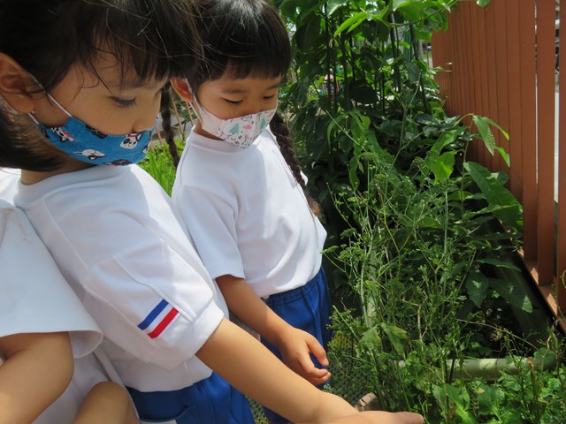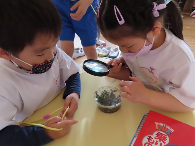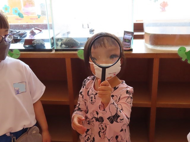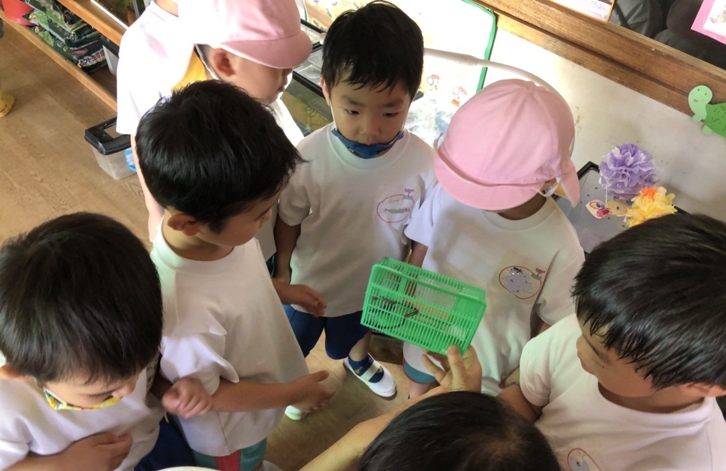 初夏から本格的な夏が訪れました。毎日のように新しい命が誕生したり、虫たちの成長や発見がいっぱいの『生き物コーナー』が大好きな年中組さん。