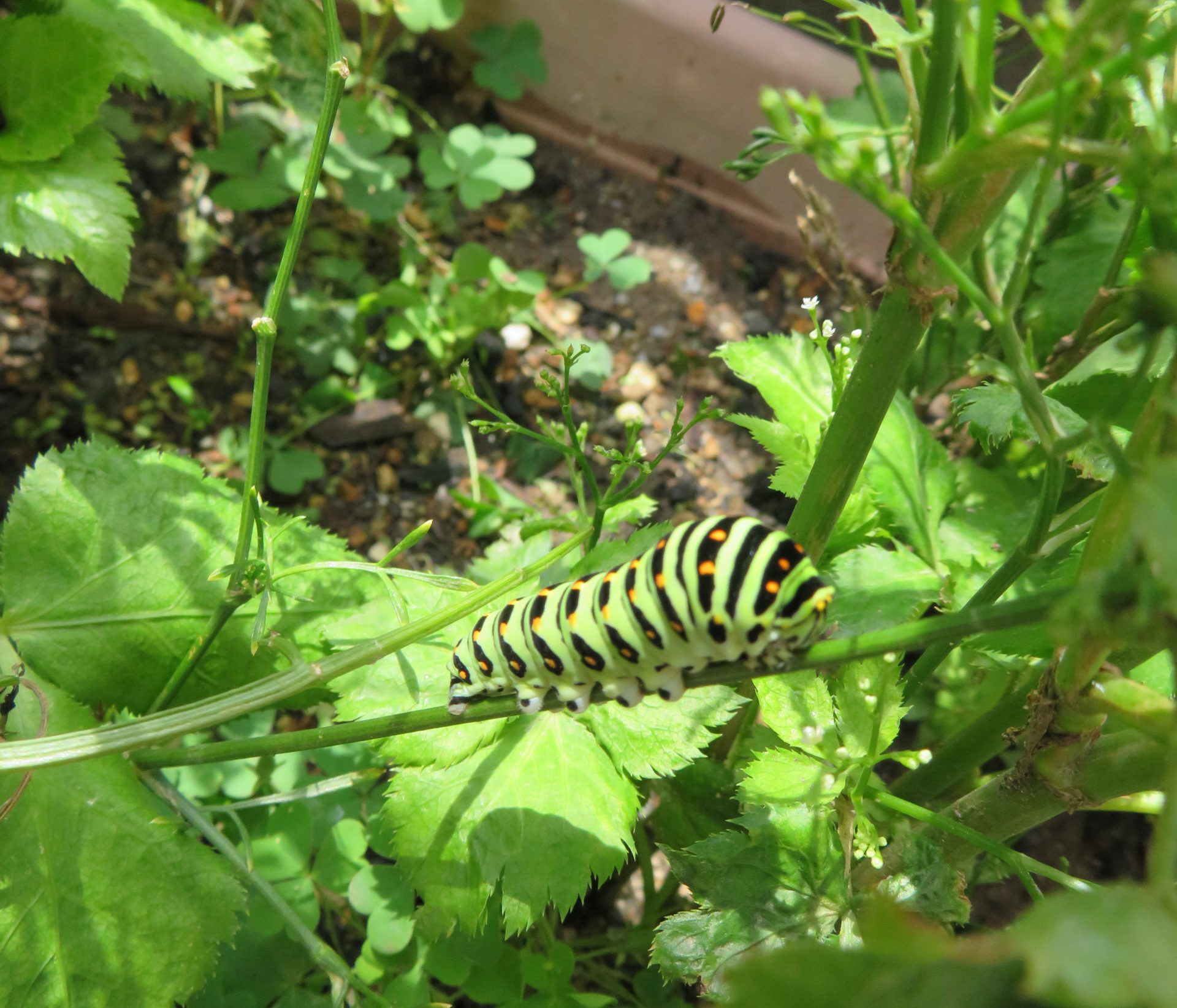 夏休み直前に、園長先生が、「生き物コーナー」で育てていたキアゲハの幼虫を、プランターの三つ葉にお引越しさせてくださいました。幼虫さんも、やっぱり広いお外は嬉しいみたいで、こんなに大きくなってモリモリ葉っぱを食べています。