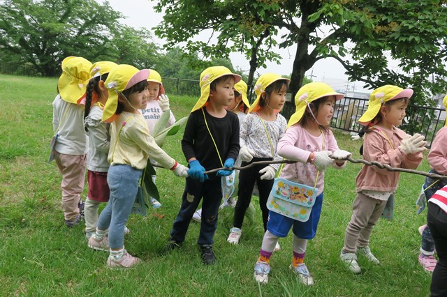 恒例の虫探しをとっても楽しみにしていた子や、お花を摘んで花束にして見せてくれたり、長~いつるで綱引きをして楽しんだり😊自然を満喫できたひとときでした。